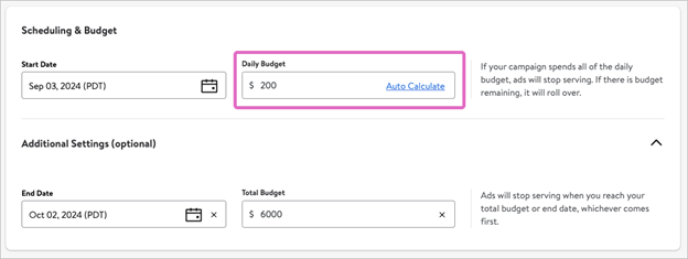 If you set both an end date and total budget, an Auto Calculate option will populate in the Daily Budget field. If you select it, the system will automatically divide your total budget by the total number of days your campaign will run, to provide an equally distributed amount. For example, if your campaign is 30 days long and you set a total budget of $6,000, selecting Auto Calculate will set your Daily budget to $200.