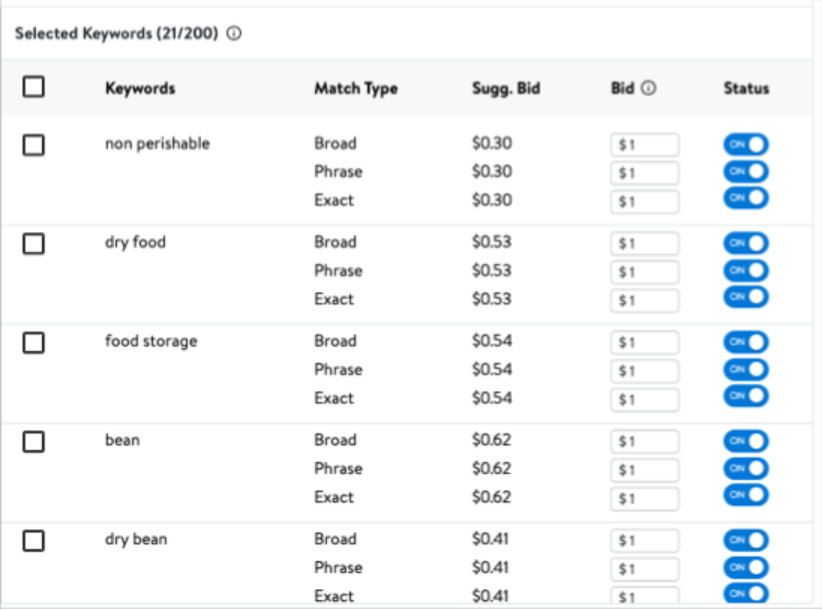 Confirm the keywords you've added in Selected Keywords on the immediate right. This section allows you to enable and disable keywords and set bids at the match type level. Refer to Setting Bids for more information on bidding.