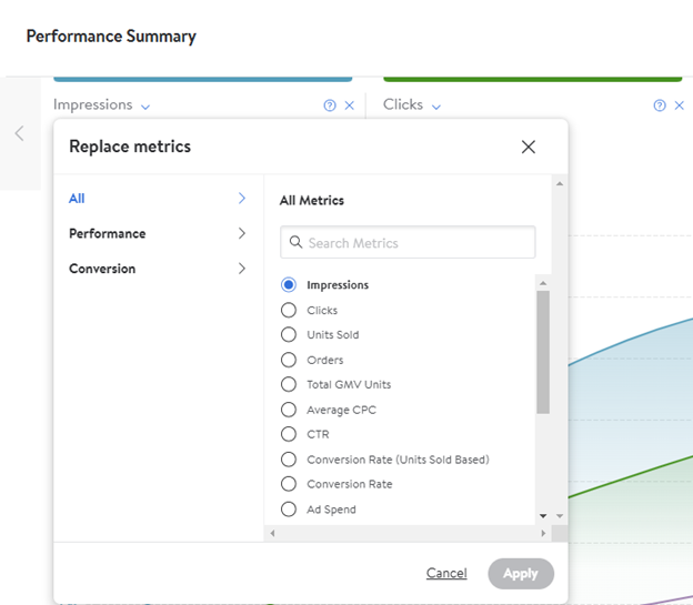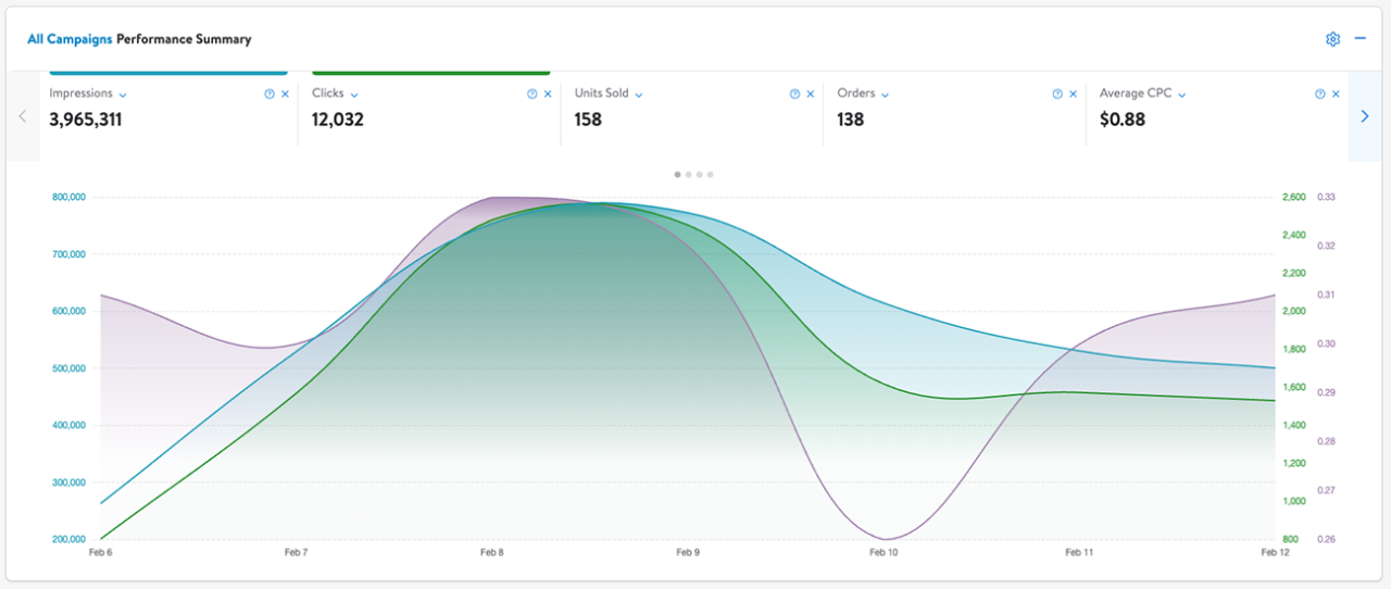 You can easily switch between metrics by selecting them along the top. Up to three metrics can be displayed at a time, so if you select a new metric to display without deselecting one, the graph will automatically deselect a metric starting on the left. All performance and conversion metrics are available but can be easily removed by deselecting the box next to them or clicking the X to the right of the field from the settings icon on the graph.