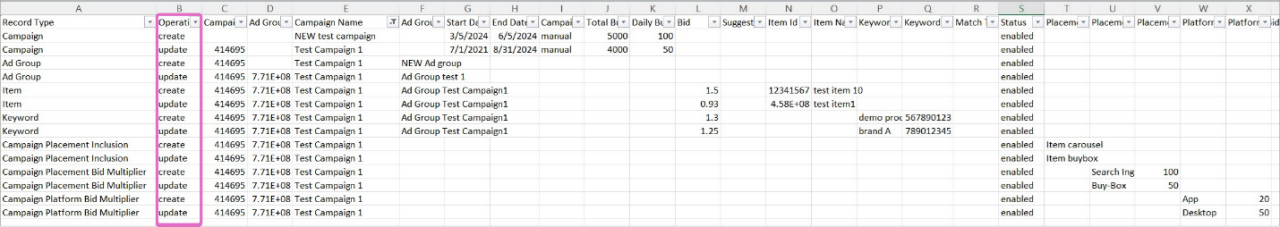 In addition to updating existing record types, you can create new campaigns and ad groups and add items, keywords, placement inclusion and bid multipliers. Creating and adding can be done in the same Excel spreadsheet as updates or in a blank bulk operations template.