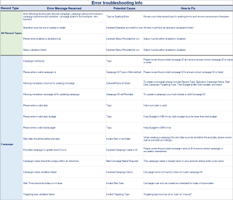 Easily download current or past campaign information into an editable Excel spreadsheet or start from a blank Excel template, then use up to 25,000 rows to create and update. Upload back into the Walmart Connect Ad Center and get detailed error feedback on any upload issues it encounters (if any). Utilize Walmart’s upload template with actionable step to prepare your bulk update sheet and address any errors identified in the feedback.