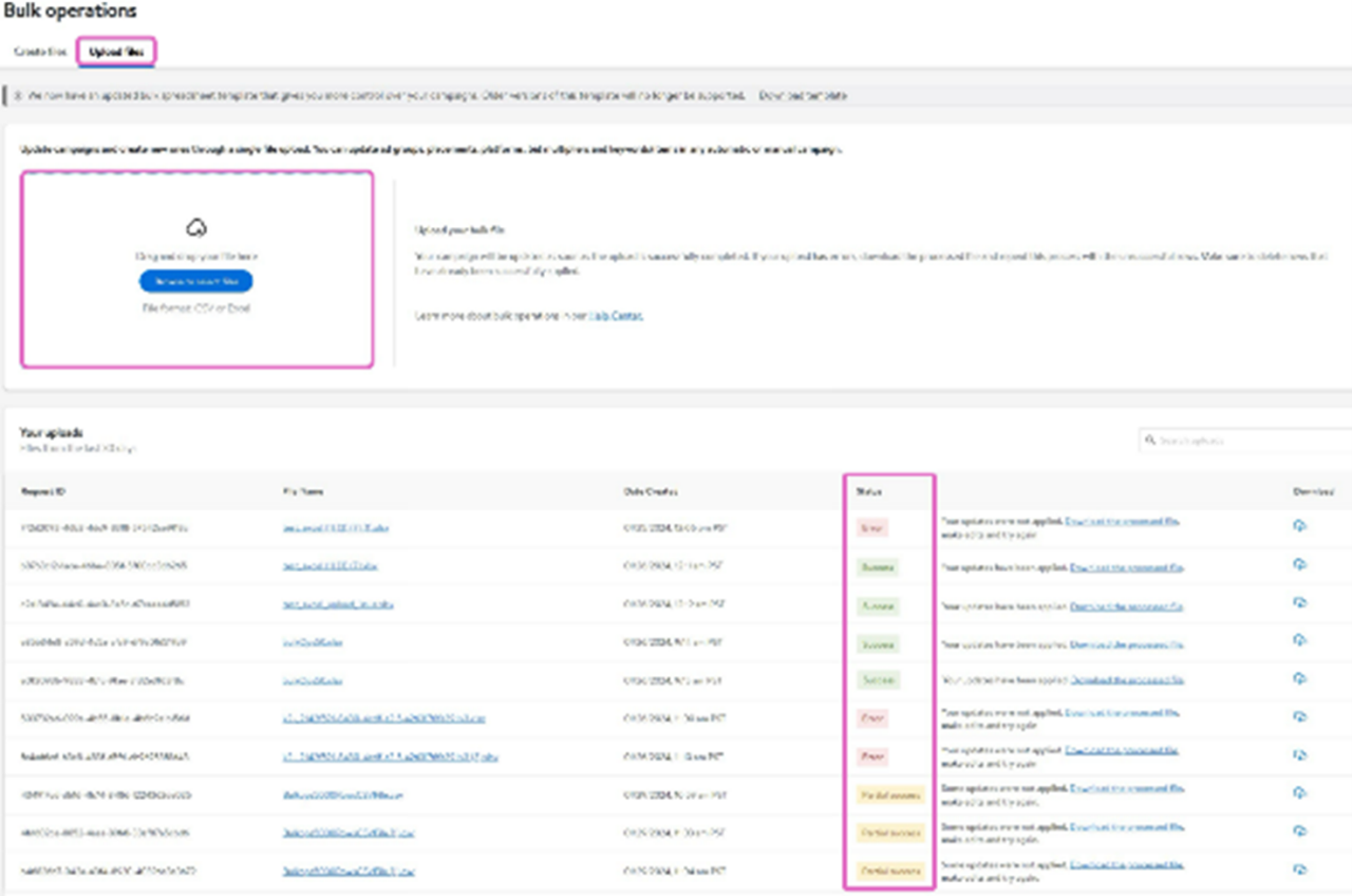 When you’re ready to upload your bulk operations file, select the Upload files tab. Drag and drop or use the browse to select files button to start your upload. Uploading is automatic after selection. Scheduling bulk operations is not an option at this time. File size is limited to 25 MB or less. If your file is larger than that, consider splitting it into two or more files.