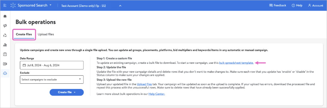 Clicking Bulk Operations takes you to the Create files tab. Bulk operations gives you the option to download an Excel spreadsheet with existing campaign and ad group information or to start with a blank template.