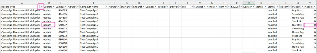 If your Excel file is particularly long, we recommend applying filters to the columns to quickly filter and sort for the rows you want to update. Since you need to delete the rows you don’t want to change, we also recommend removing the default entry under Operation (default is update from download) to help track which rows you are changing.