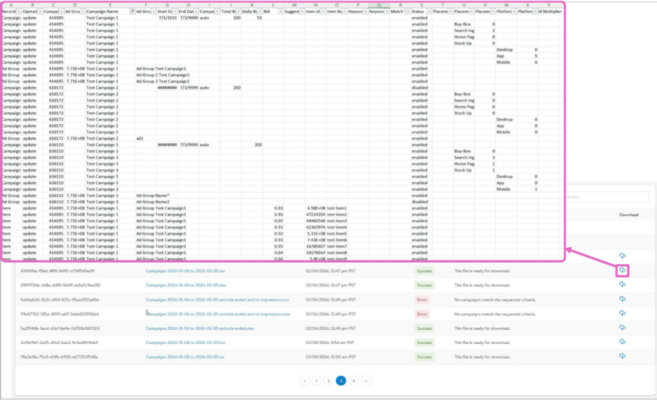 Download the file from the Created files list using the download icon. It may take several minutes for the list to generate, depending on the amount and size of the campaigns meeting your date range and exclusion preferences.
